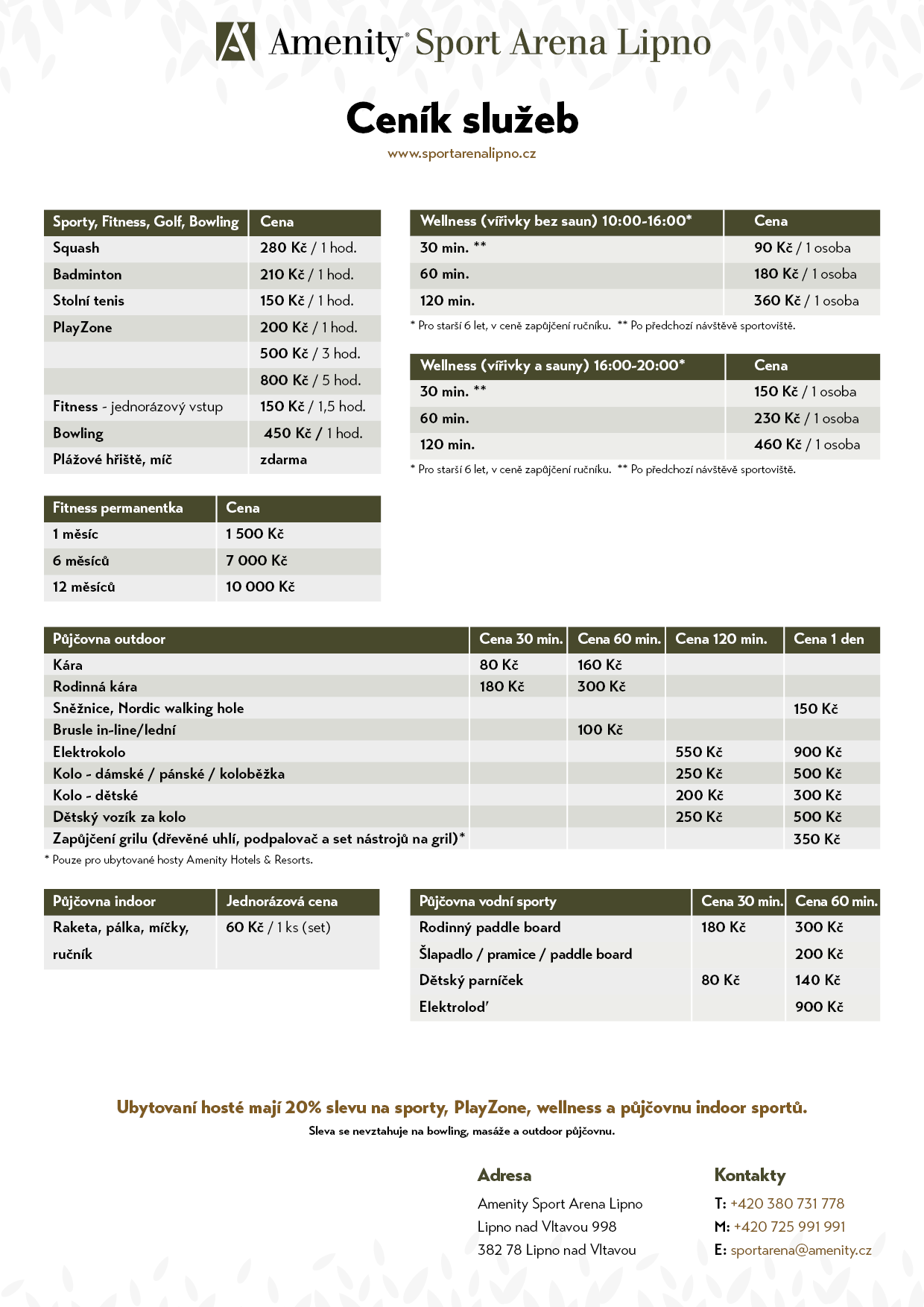 Ubytovaní hosté mohou uplatnit 20% slevu na všechna sportoviště, wellness a půjčovnu indoor sportů. Sleva se nevztahuje na bowling, masáže a outdoor půjčovnu.